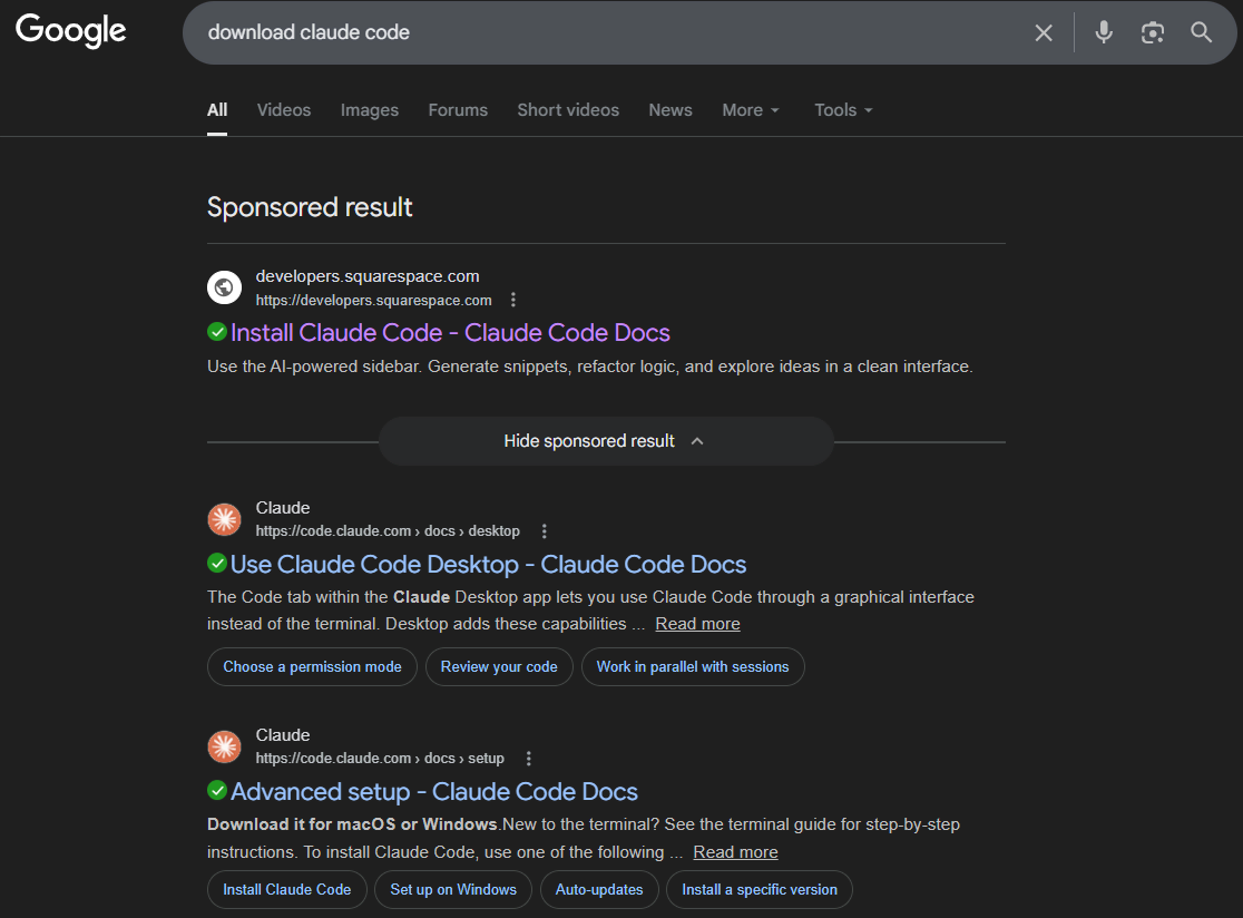 Суть атаки заключается в классической, но оттого не менее эффективной схеме социальной инженерии. Вместо поиска и эксплуатации технических уязвимостей в программном обеспечении злоумышленники сфокусировались на человеческом факторе. Они приобрели рекламное объявление в Google, которое появляется при поиске запросов вроде «download claude code». Объявление, помеченное как спонсируемый результат и использующее официальный брендинг Claude, выглядело абсолютно легитимно, что повышало доверие пользователей. Клик по нему перенаправлял жертву не на официальный сайт, а на фишинговую страницу, размещенную на субдомене популярного конструктора сайтов Squarespace.