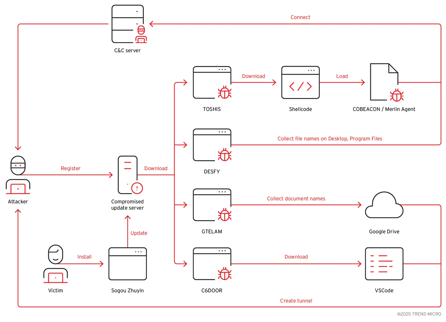 Атака началась с компрометации доменного имени sogouzhuyin[.]com, которое ранее принадлежало разработчику метода ввода для традиционной китайской фонетической системы чжуинь. После регистрации домена злоумышленники организовали на нём распределение вредоносных обновлений для официального клиента Sogou Zhuyin, который не обновлялся с 2019 года. Жертвы, установившие легальную версию программы, впоследствии автоматически получали malicious-пакеты (вредоносные нагрузки), содержащие несколько семейств вредоносного ПО.