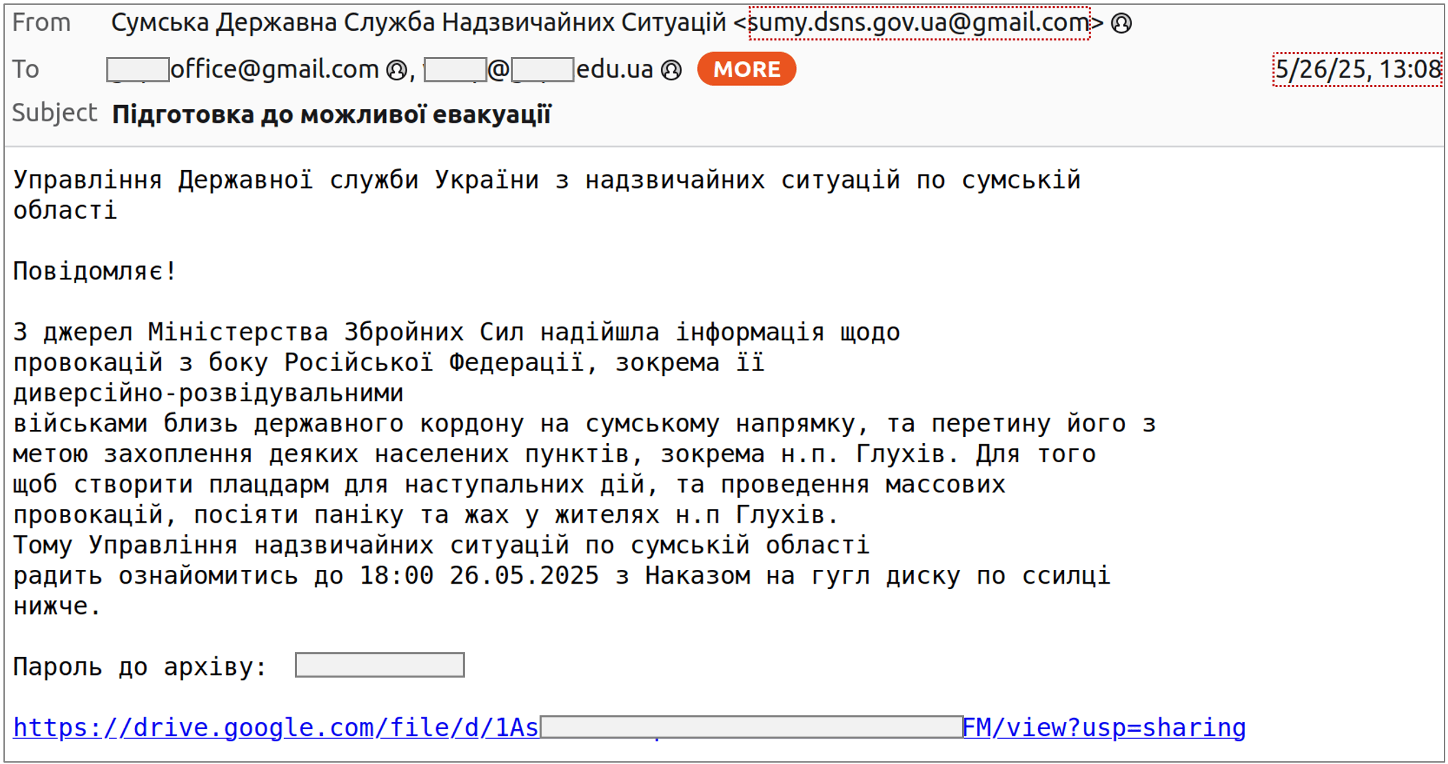 Атака началась с массовой рассылки фишинговых писем от имени компрометированного аккаунта Gmail, принадлежащего одному из высших учебных заведений региона. Злоумышленники использовали тему "Приказ № 332", что создавало видимость официального документа. В письме содержалась ссылка на архив в Google Drive, защищенный паролем для дополнительного доверия жертв.
