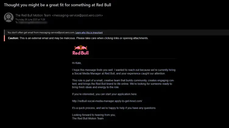Фишинговые атаки остаются одной из ключевых угроз в сфере информационной безопасности, несмотря на внедрение систем фильтрации электронной почты, механизмов аутентификации и защиты конечных точек. Злоумышленники постоянно совершенствуют свои методы, обходя автоматизированные средства защиты. Последняя кампания, выявленная Security Operations Center (SOC) компании Evalian, демонстрирует новый уровень изощренности: мошенники рассылают поддельные письма от имени Red Bull, предлагая вакансии, с целью кражи учетных данных пользователей.