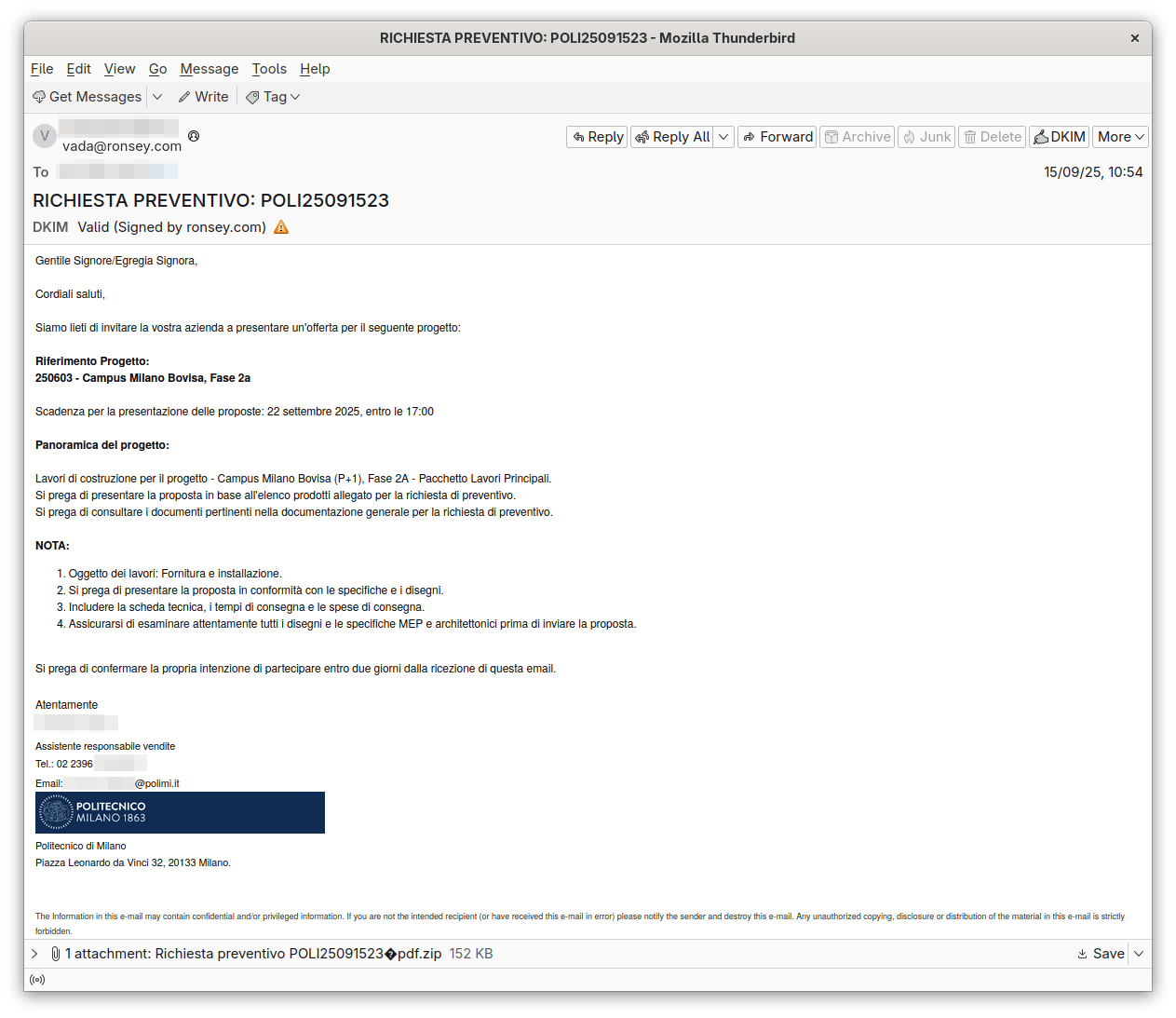 В последние дни эксперты CERT-AGID выявили и проанализировали целенаправленную кампанию по распространению вредоносной программы FormBook через электронные письма, предположительно направленные сотрудникам строительной отрасли. Сообщения, качественно оформленные и детально проработанные, имитируют коммуникацию от имени офиса Миланского политехнического университета и приглашают получателей подать заявку на участие в якобы существующем проекте с сжатыми сроками.