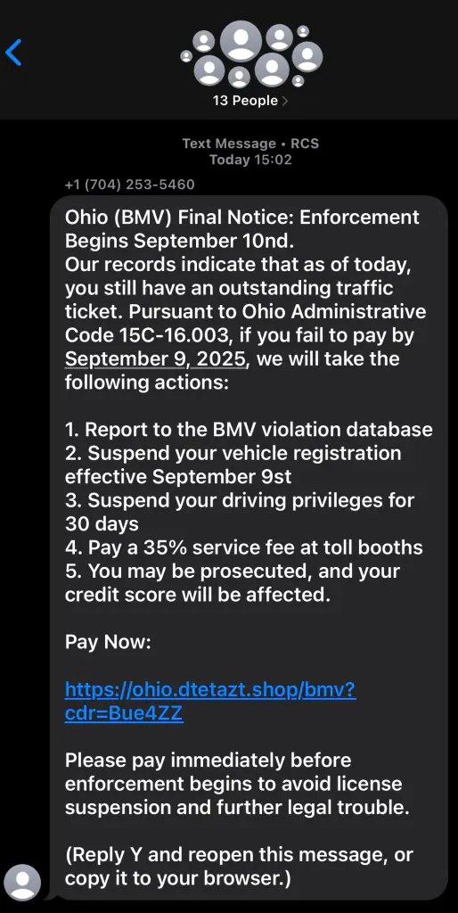 Типичное сообщение, полученное одним из сотрудников Malwarebytes, содержит угрозы приостановки регистрации транспортного средства, блокировки прав на 30 дней, а также уплаты дополнительных сборов. Особое внимание привлекают многочисленные грамматические ошибки: например, даты указаны как «September 10nd» и «September 9st». Также мошенники ссылаются на несуществующие нормативные акты, такие как «Ohio Administrative Code 15C-16.003», что сразу выдает фальшивку.