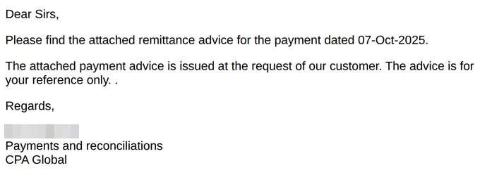 Злоумышленники применяют сложную схему социальной инженерии, рассылая сообщения с темой "remittance advice for the payment dated 07-Oct-2025". В письмах содержатся краткие тексты с просьбой ознакомиться с прикрепленным документом о платеже, сопровождаемые изображениями, имитирующими корпоративные бланки компаний. Для придания правдоподобности атаки используются поддельные алиасы отправителей, такие как "CPA-Payment Files", и отображаемые имена, ссылающиеся на CPA Global или Clarivate.