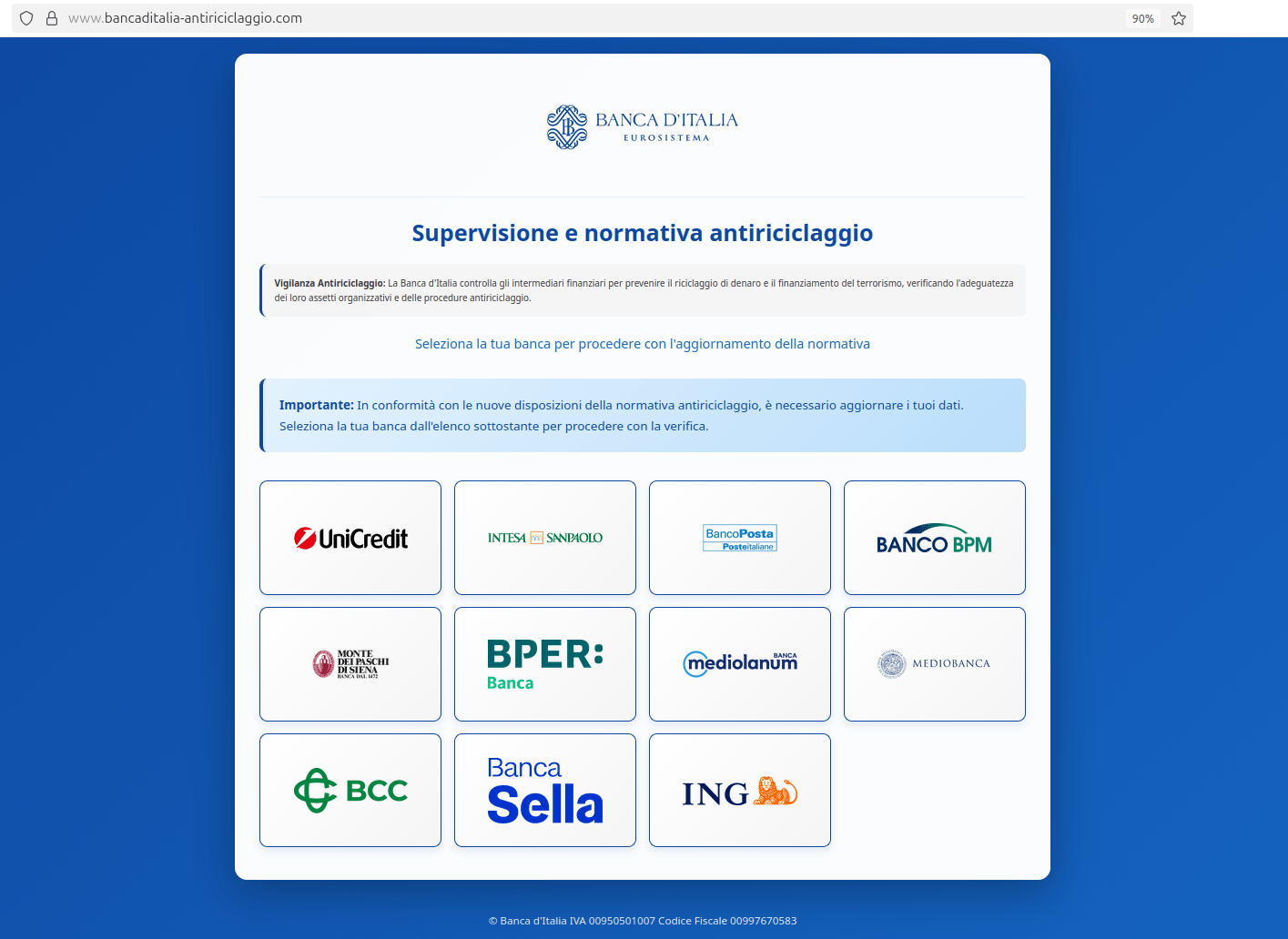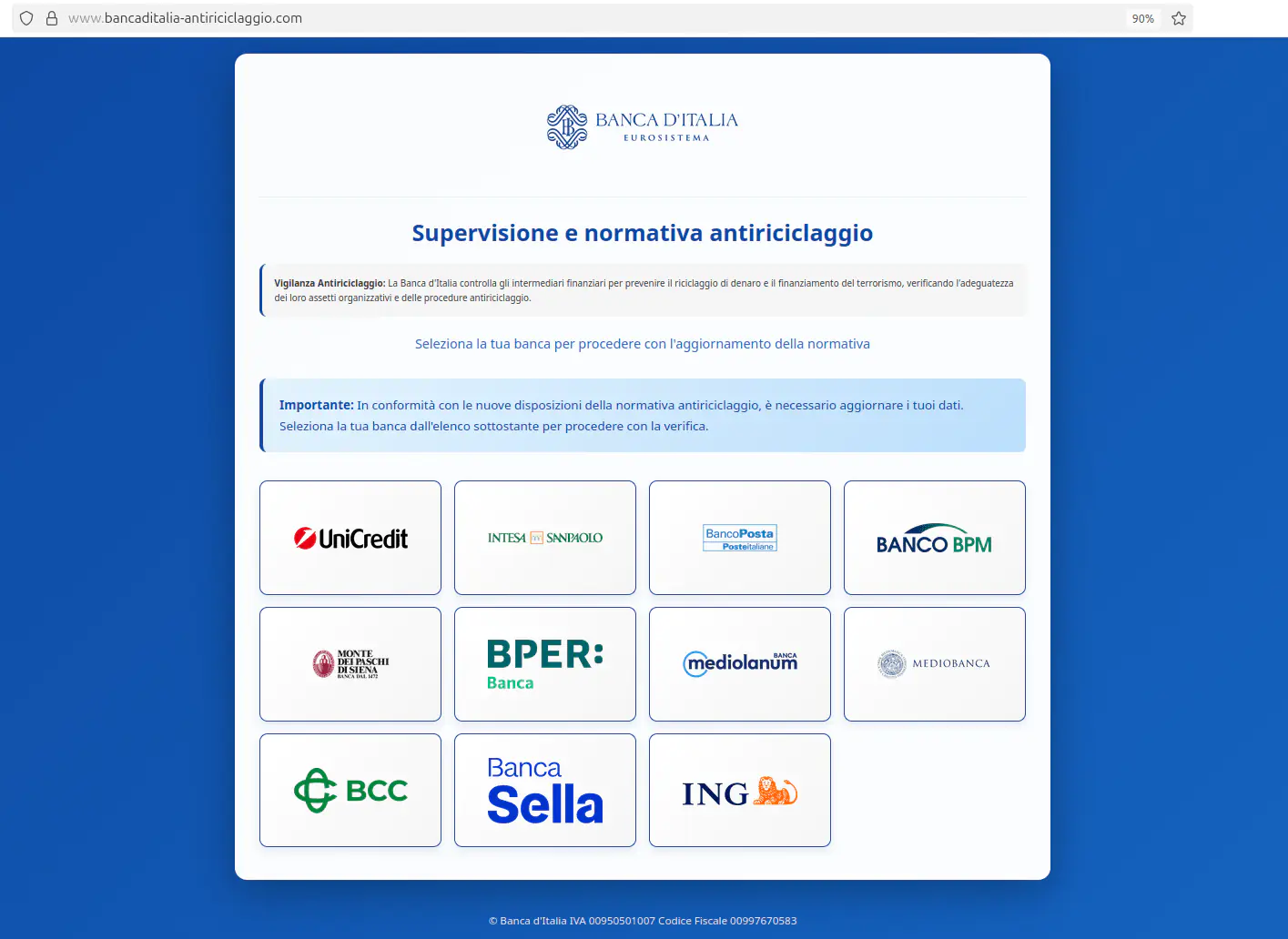 В Италии зафиксирована масштабная фишинговая кампания, в которой злоумышленники незаконно используют авторитет и логотип Банка Италии для сбора конфиденциальных данных граждан. По информации CERT-AGID (Computer Emergency Response Team - AgID, группа реагирования на компьютерные инциденты при Агентстве по цифровизации Италии), мошенники создали поддельный веб-сайт, имитирующий официальную платформу для обновления персональных данных в соответствии с "новыми положениями законодательства о противодействии отмыванию денег".