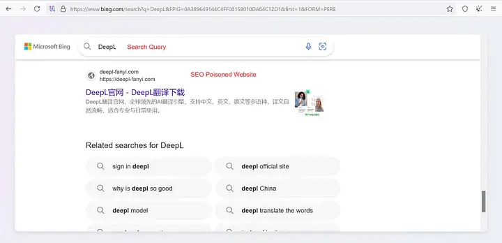 Когда жертва ищет на китайском языке ключевые слова, связанные с программным обеспечением для перевода DeepL, ей часто показываются отравленные результаты поиска, расположенные на первой странице поисковых систем, в частности Bing и Baidu, которые широко используются в регионе. Эти ссылки с высоким рейтингом ведут ничего не подозревающих пользователей на поддельные страницы загрузки DeepL, разработанные для имитации официального веб-сайта DeepL Translator. Исследовательская группа Defentive успешно воспроизвела этот сценарий атаки. Веб-сайт-имитатор близко копирует брендинг и макет DeepL, содержа обманчивые заголовки на китайском языке, такие как: «Опыт использования DeepL Translator для Windows на официальном сайте DeepL».