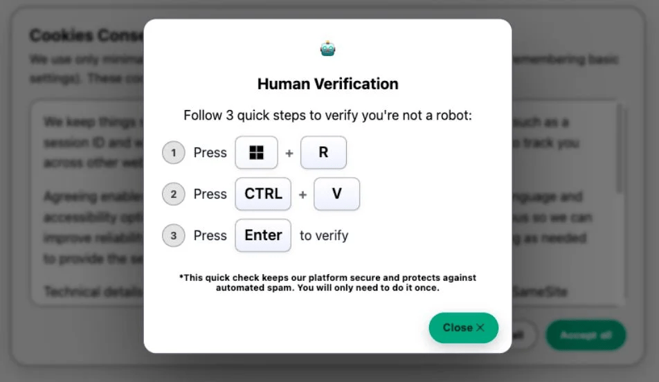 Изначально атака начинается с посещения пользователем поддельной страницы проверки на робота или реалистичной имитации экрана обновления Windows. В обоих сценариях жертву просят нажать Win+R и вставить заранее скопированную команду, которая запускает сложную цепочку выполнения. При этом вместо стандартного добавления данных к файлу, вредоносный код кодируется непосредственно в пиксельных данных изображений с использованием определенных цветовых каналов.