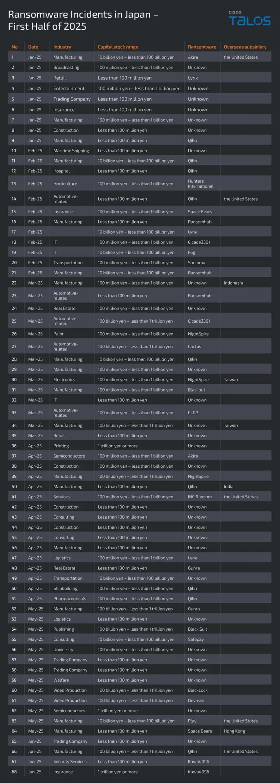 Количество инцидентов, связанных с ransomware-атаками в Японии, в первом полугодии 2025 года увеличилось примерно в 1,4 раза по сравнению с аналогичным периодом прошлого года. Согласно исследованию Cisco Talos, в течение шести месяцев было зафиксировано 68 случаев поражения организаций вредоносным ПО для шифрования данных, тогда как годом ранее их было 48. Эксперты отмечают, что основными мишенями злоумышленников остаются малые и средние предприятия, а наиболее уязвимой отраслью продолжает оставаться производственный сектор.