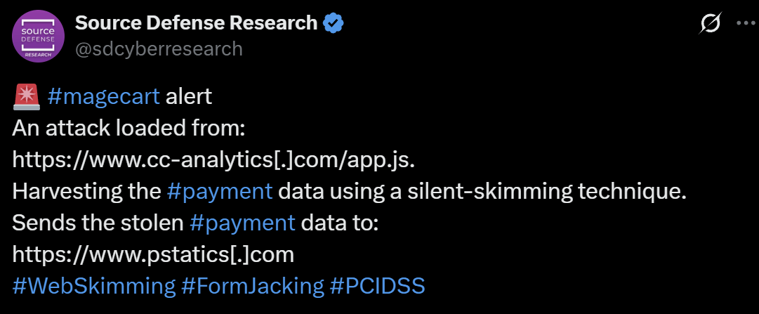 Всё началось с публикации в Twitter от аккаунта sdcyberresearch, где упоминалась возможная кампания в стиле Magecart, связанная с внедрением вредоносного JavaScript для перехвата платёжной информации. Первоначальный образец скрипта размещался на домене cc-analytics[.]com в файле app.js и был сильно обфусцирован для затруднения анализа.