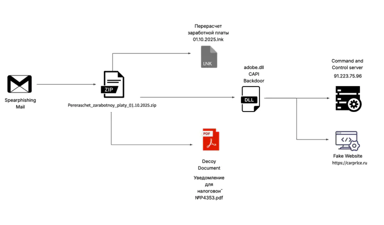 Кампания направлена против компаний автомобильной промышленности и электронной коммерции в Российской Федерации. Первые следы активности были зафиксированы 3 октября 2025 года, когда на Virustotal появился вредоносный ZIP-архив с названием "Перерасчет заработной платы 01.10.2025". Архив содержал фишинговые документы и конечный .NET-имплант CAPI Backdoor.