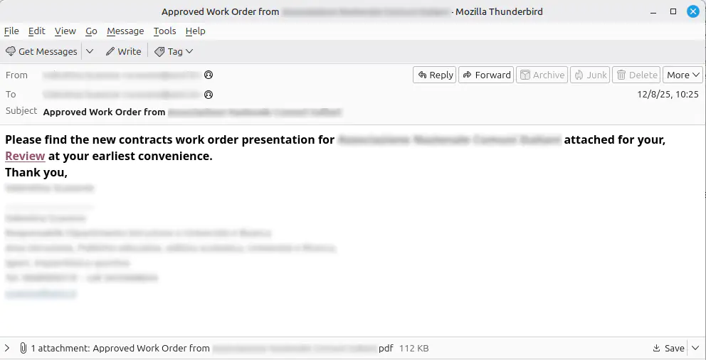 Механизм атаки начинается с получения целевым сотрудником электронного письма. Сообщения, как правило, составлены на английском языке, хотя в некоторых случаях тело письма написано по-итальянски. Особенностью рассылки является скрытие списка получателей с помощью функции «СК» (слепая копия). Письмо содержит одно или несколько вложений в формате PDF.