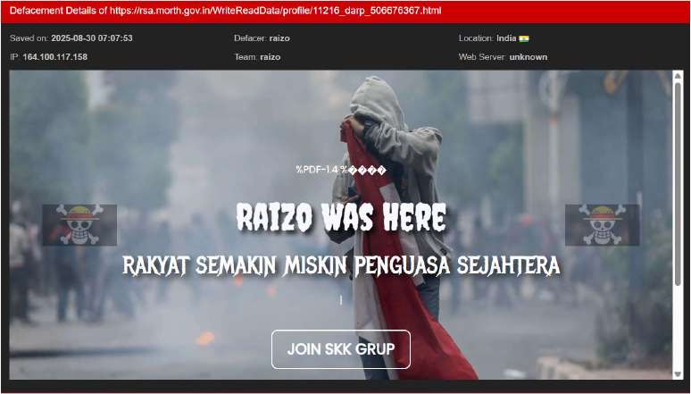 Индонезийская группа Raizo провела дефейс сайта индийского транспортного ведомства (rsa.morth.gov.in), разместив политические лозунги на индонезийском языке. Это указывает на расширение круга участников киберконфликтов и использование цифровых атак в качестве инструмента трансграничного политического активизма.