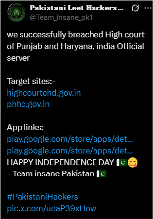 Пакистанская группа Team Insane Pakistan взяла на себя ответственность за компрометацию серверов Высоких судов Пенджаба, Харьяны и Андхра-Прадеш. Злоумышленники заявили о хищении миллионов судебных записей, данных FIR (первоначальных полицейских протоколов), учетных данных пользователей и баз данных судебных чиновников. Эти инциденты были приурочены к празднованию Дня независимости Пакистана и сопровождались публичными насмешками над индийской судебной системой.