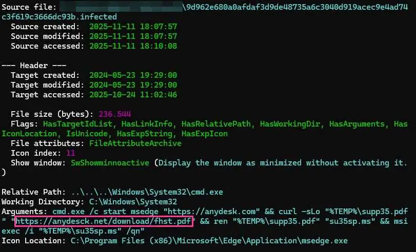 Атака начинается с целевого фишингового письма, содержащего ZIP-архив с единственным LNK-файлом. При его запуске происходит многостадийная компрометация, ориентированная на минимальную заметность и обеспечение устойчивости. При этом в фоновом режиме LNK-файл запускает Microsoft Edge и открывает легитимный сайт anydesk[.]com, создавая у пользователя иллюзию нормальной работы программы.