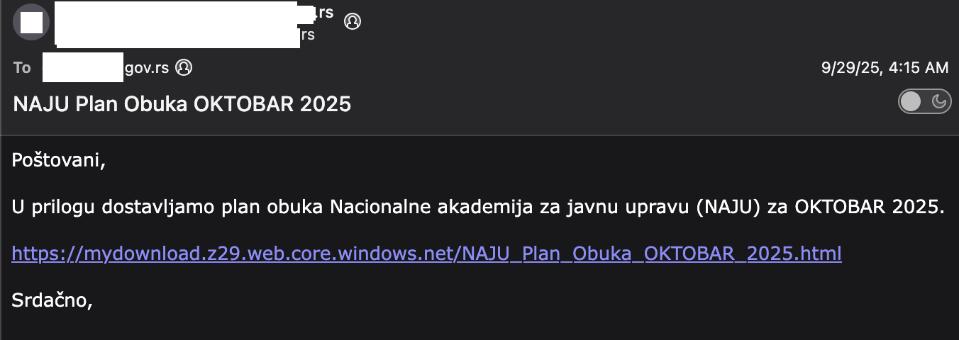 Особенностью этой кампании стала уникальная методика обфускации URL-адресов. Злоумышленники использовали механизм кодирования с применением операции XOR и ключа 23, преобразующего десятичные значения в читаемый URL-адрес. После декодирования строка вела на ресурс mydownload.z29.web.core.windows.net, где размещался архив с именем "NAJU Plan Obuka OKTOBAR 2025.zip".