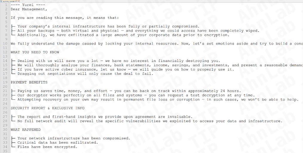Важной особенностью является продуманная система исключений. Yurei избегает шифрования критически важных для работы системы каталогов, включая windows, system32 и program files. Также защищены ключевые расширения файлов (.exe, .dll, .sys) и системные файлы (bootmgr, bcd). Интересно, что в список исключений включены собственные артефакты шифровальщика - расширение .Yurei и файл с инструкциями _README_Yurei.txt, что предотвращает повторное шифрование и гарантирует доступность ransom note (вымогательского сообщения) для жертв.