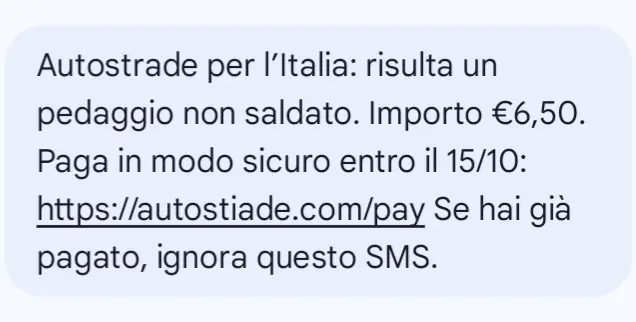 В Италии зафиксирована масштабная кампания смшинга (SMS-фишинг), нацеленная на пользователей автомагистралей. Злоумышленники рассылают поддельные текстовые сообщения от имени компании Autostrade per l’Italia, уведомляя получателей о якобы неоплаченных дорожных сборах. По данным национального центра кибербезопасности CERT-AGID, сообщения содержат ссылку, ведущую на мошеннический сайт, где требуется ввести личные и платежные данные.