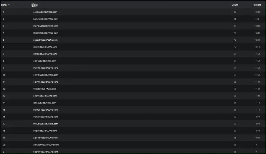 Интересно, что исследователи Darktrace обнаружили закономерности в генерации доменов. Первые пять символов изменяются для создания списка доменных имен, тогда как завершающая часть остается постоянной: 60b33d7929a. Кроме того, была выявлена потенциальная вторая seed-фраза для генерации, ранее не документированная в открытых источниках. Генерируемые домены использовали домены верхнего уровня .com, .net и .top.