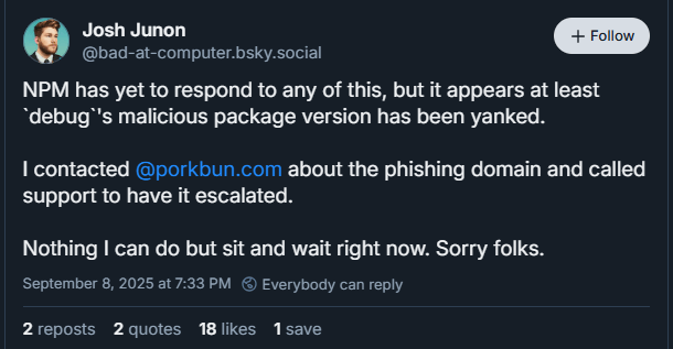 Домен npmjs.help был зарегистрирован всего за три дня до атаки. В состоянии спешки Джунон перешёл по ссылке и ввёл свои учётные данные, что предоставило злоумышленникам полный доступ к его аккаунту npm. В течение нескольких минут они начали публиковать вредоносные версии его пакетов.