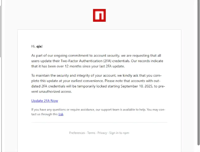Инцидент начался 8 сентября, когда Джош Джунон, известный сопровождающий открытого кода под псевдонимом Qix, получил фишинговое письмо, маскирующееся под официальное уведомление службы поддержки npm.