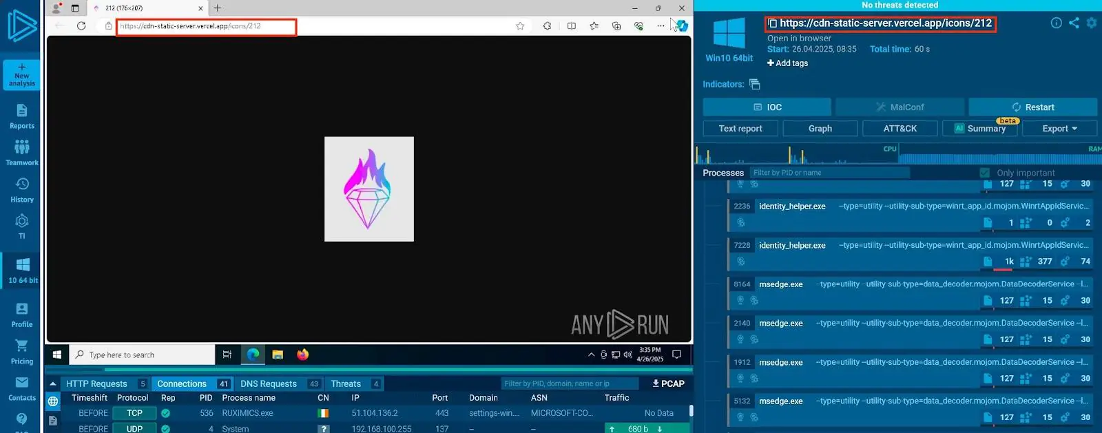 Другой метод, обнаруженный исследователями, предполагает разделение URL на несколько частей внутри кода, что осложняет автоматизированный анализ. В частности, Lazarus Group использовала платформу Vercel.App в качестве сервера команд и управления (C2) для доставки favicon, что создает дополнительный уровень маскировки. При этом злоумышленники внедрили механизм, при котором отсутствие определенного токена в запросе приводит к отображению легитимного изображения, что может ввести в заблуждение системы мониторинга.