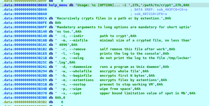 Строки в бинарнике скрыты через XOR-обфускацию с базовым значением "0x39" (57). Алгоритм применяет побайтовый rolling XOR до нулевого символа. При декодировании обнаружены ключевые элементы: меню помощи ("--help"), шаблоны логов, команды для управления виртуальными машинами (включая "vm-support", "vmdumper", "vim-cmd") и тексты ransom-нот.