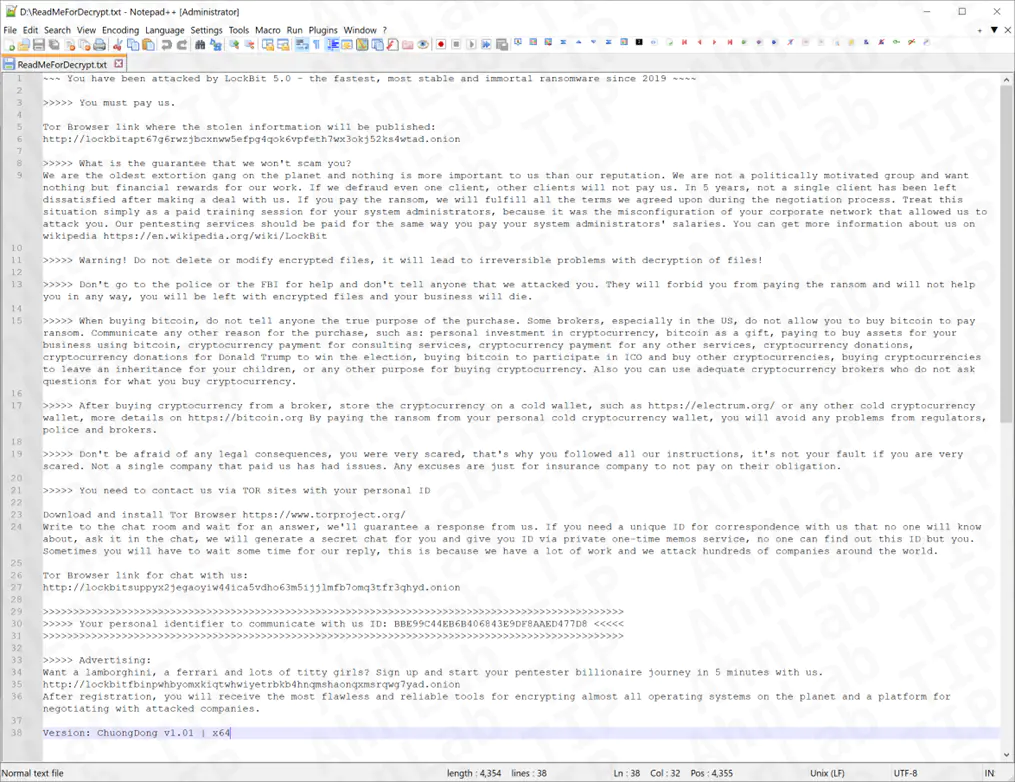 Процесс шифрования зависит от размера файла. Для файлов менее 0x5000000 байт используется единый ключ на основе алгоритма ChaCha20. В конец такого файла добавляется служебная информация, включая открытый ключ жертвы. Для более крупных файлов данные шифруются блоками, и для каждого блока вычисляется и сохраняется контрольная хэш-сумма. Требование выкупа, оставляемое в файле ReadMeForDecrypt.txt, содержит типичные для группировки угрозы. Злоумышленники предупреждают, что самостоятельные попытки восстановления или обращение в сторонние сервисы приведут к безвозвратной потере данных. Кроме того, они угрожают удалить ключ дешифровки и выставить украденную информацию на продажу в даркнете, если факт взлома станет достоянием общественности или правоохранительных органов.