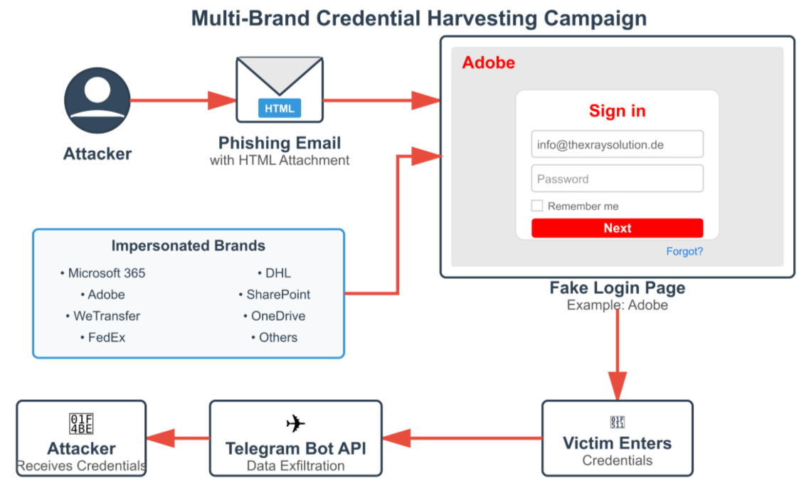 Исследовательская группа Cyble Research and Intelligence Labs (CRIL) обнаружила масштабную фишинговую кампанию, нацеленную на множество брендов для кражи учетных данных. Злоумышленники рассылают вредоносные HTML-вложения через электронную почту, успешно обходя традиционные средства защиты благодаря отсутствию подозрительных URL-адресов и внешних серверов хостинга. Встроенные HTML-файлы выполняют JavaScript-код, который перехватывает учетные данные пользователей и отправляет их напрямую подконтрольным злоумышленникам ботам в Telegram.