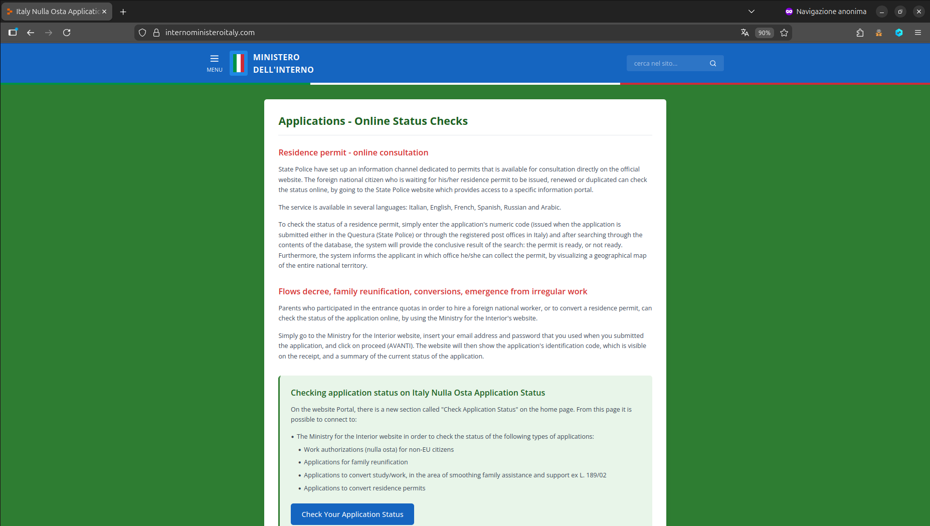 Фальшивый сайт профессионально имитирует дизайн и содержание государственных сервисов. На главной странице мошенники предлагают проверить статус обработки заявления на вид на жительство, утверждая, что для этого достаточно ввести номер дела. Кроме того, сайт ссылается на другие реальные административные процедуры, такие как декрет о потоках (decreto flussi), воссоединение семьи и вопросы нерегулярной занятости. Это делается для повышения правдоподобия ресурса и доверия со стороны потенциальных жертв, которые могут быть знакомы с этими бюрократическими процессами.