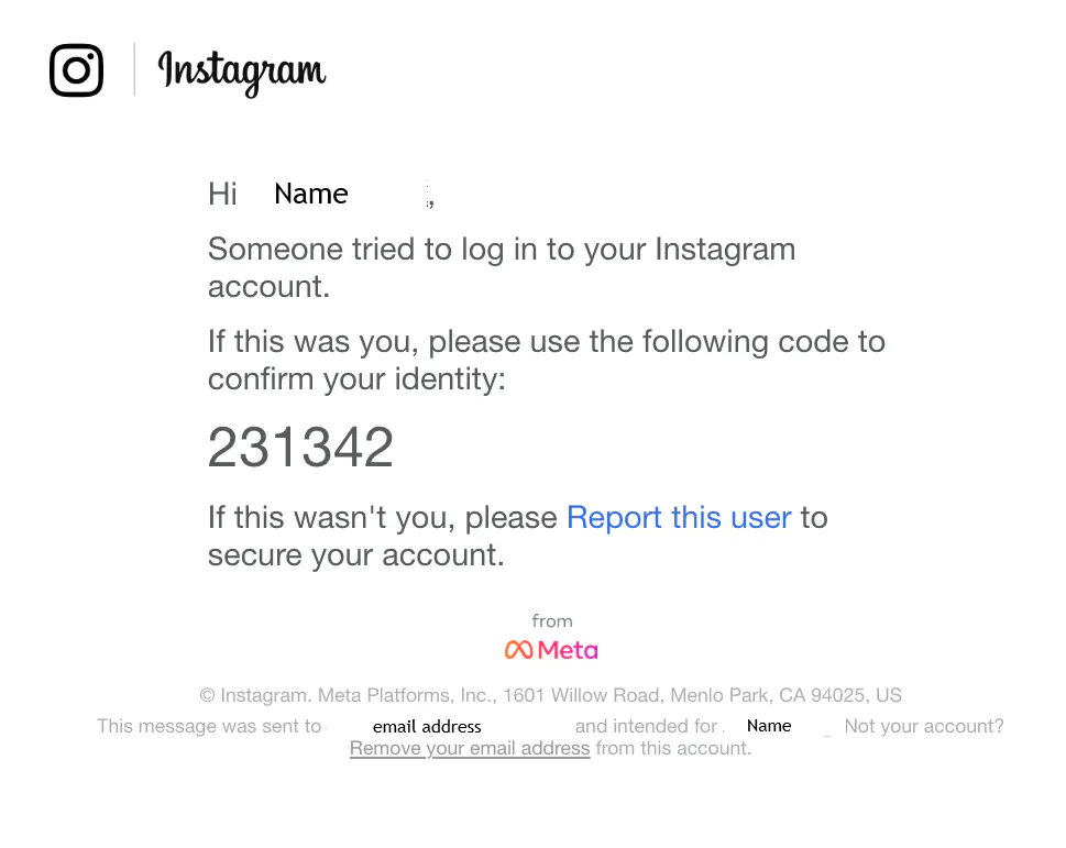 Письмо выглядит как официальное уведомление от Instagram* и содержит сообщение о попытке несанкционированного входа в аккаунт. В тексте указан случайный код и предложение «сообщить о подозрительной активности», нажав на соответствующую ссылку. Однако вместо перехода на страницу поддержки пользователь попадает в интерфейс почтового клиента, где уже указан подозрительный адрес получателя.