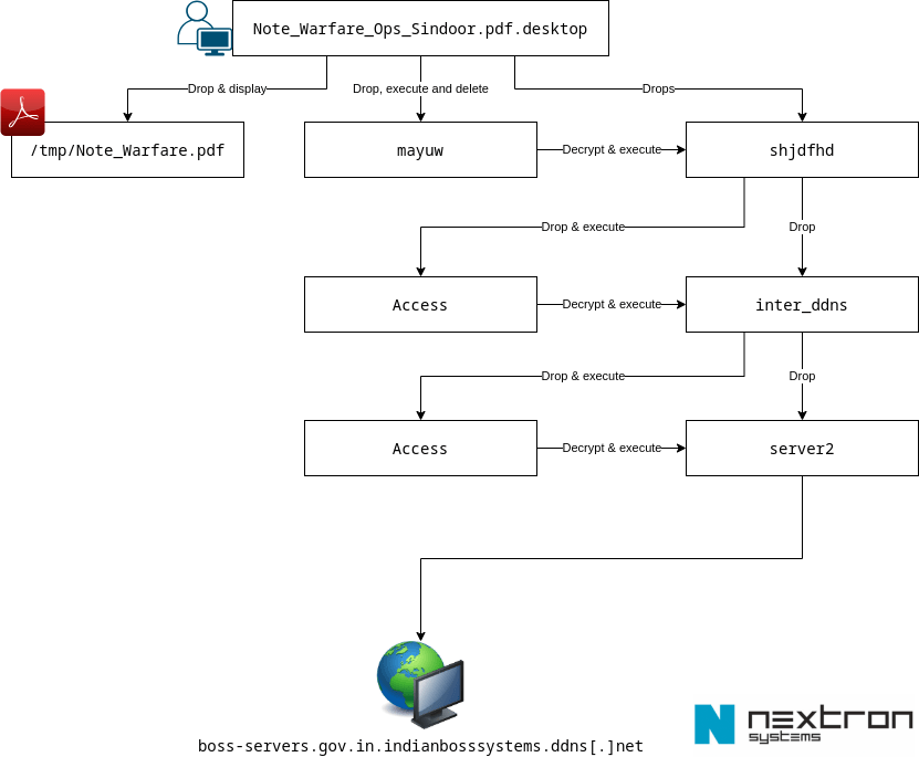 Вредоносный .desktop файл создан так, чтобы казаться безобидным, маскируясь под легитимный документ. На рабочем столе жертвы он отображает значок, напоминающий файл PDF, что заманивает пользователя в ловушку выполнения. При запуске файл открывает безобидный на вид документ-приманку PDF, чтобы усилить иллюзию легитимности. Пока пользователь сосредоточен на открытом документе, фоновый процесс тихо запускает обфусцированные процедуры, инициирующие цепочку развертывания, которая в конечном итоге устанавливает полезную нагрузку MeshAgent. Этот подход сочетает социальную инженерию со скрытностью, маскируя вредоносную активность под безвредный файл.