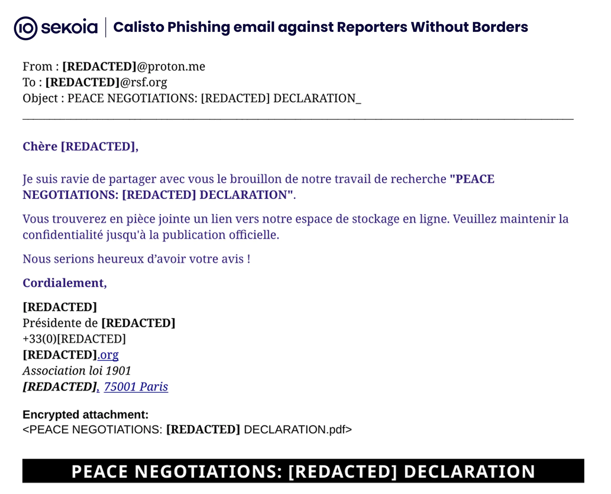 В марте 2025 года к аналитикам TDR обратились «Репортёры без границ» по поводу подозрительного письма, полученного одним из ключевых сотрудников. Организация, защищающая свободу прессы по всему миру и оказывавшая поддержку журналистам, стала мишенью для атаки. Фишинговое письмо поступило с адреса ProtonMail, оформленного как письмо от доверенного лица, и содержало просьбу ознакомиться с документом, который не был прикреплён. После запроса от жертвы оператор Calisto отправил ответное письмо на английском языке со ссылкой на скомпрометированный веб-сайт, который перенаправлял на URL в ProtonDrive. Предположительно, там располагался вредоносный PDF-файл, однако сама учетная запись злоумышленника была заблокирована ProtonMail.