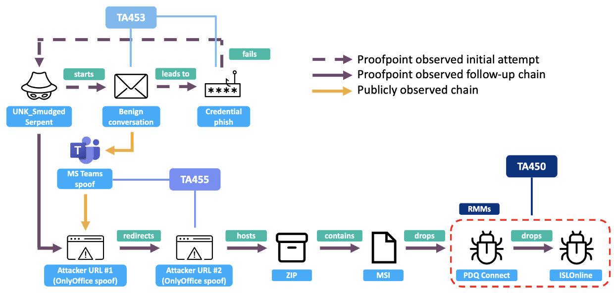 Завершающая стадия атаки демонстрировала сходство с TA450 (MuddyWater). После загрузки ZIP-архива с поддельными документами злоумышленники развертывали инструменты удаленного управления и мониторинга (RMM) - PDQConnect и ISL Online. Использование RMM-инструментов редко встречается у государственных хакеров и ранее документировалось только у TA450.
