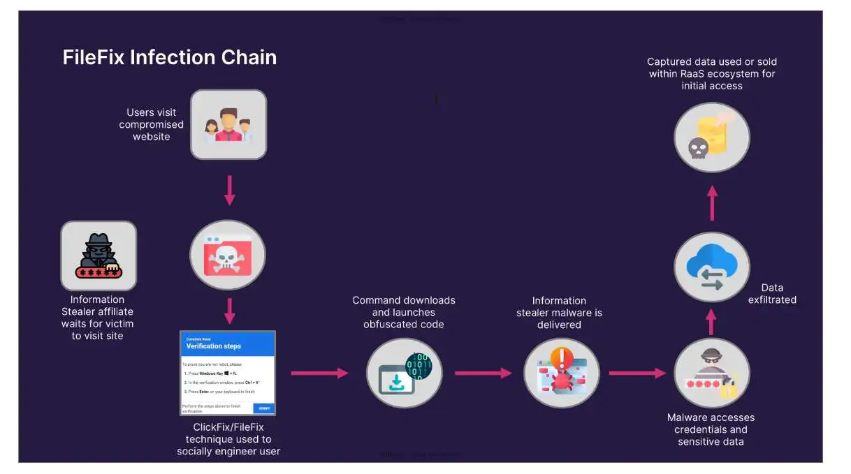 ClickFix, впервые обнаруженный в 2024 году, быстро gained популярность среди злоумышленников, включая TA571, TA569 и брокеров первоначального доступа. Метод основан на обмане пользователей: через поддельные CAPTCHA-запросы или фиктивные формы загрузки файлов жертву убеждают вручную скопировать и выполнить код в системе. Традиционно для этого использовалось окно "Выполнить", однако FileFix меняет подход.