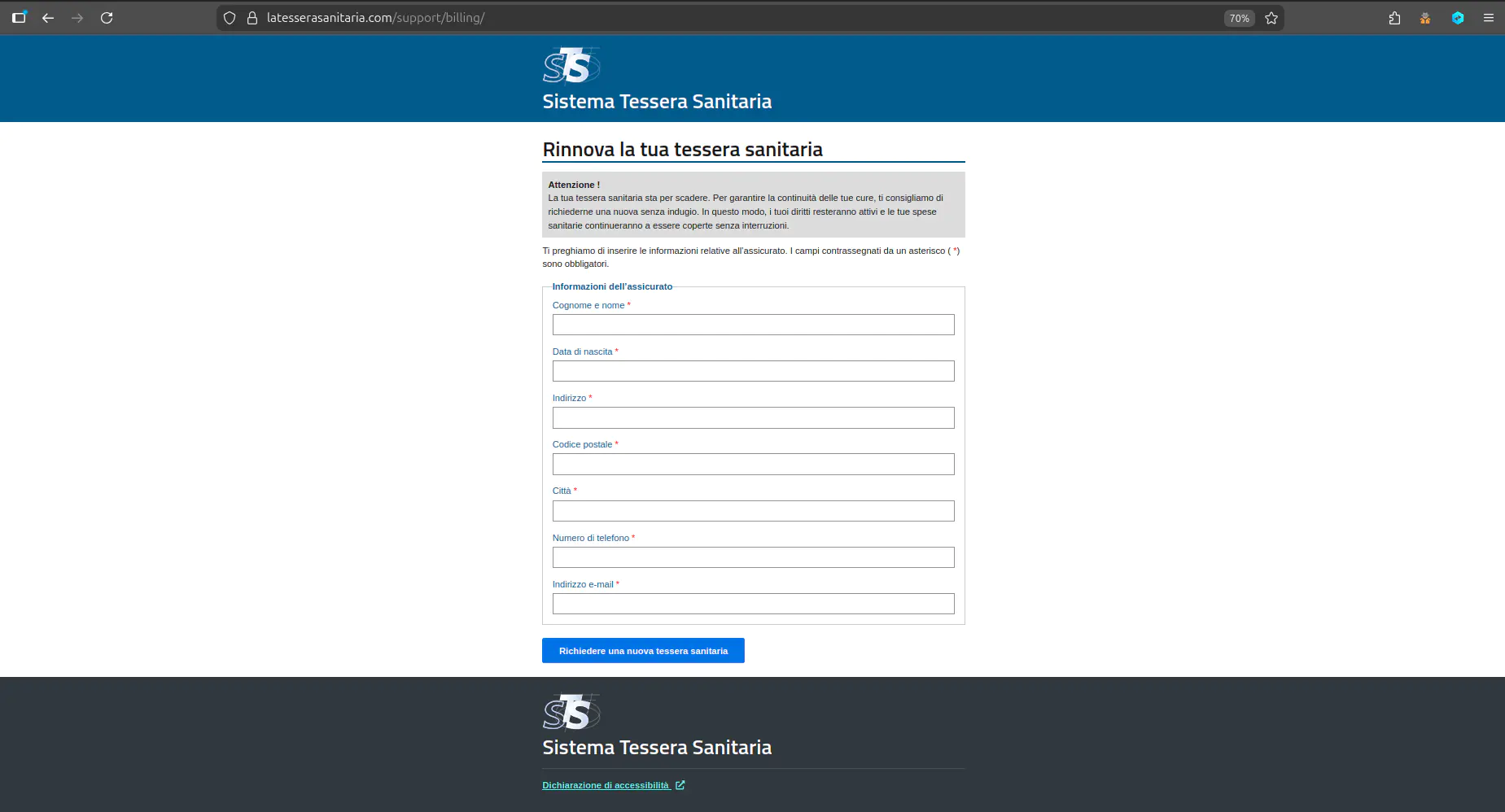 Нажатие на эту ссылку приводит пользователя не на официальный государственный портал, а на фишинговый сайт. Этот ресурс размещен на специально зарегистрированном доменном имени latesserasanitaria[.]com, которое имитирует название реальной службы. Дизайн страницы также тщательно подделан под легитимный сервис обновления данных, что призвано усыпить бдительность жертвы.