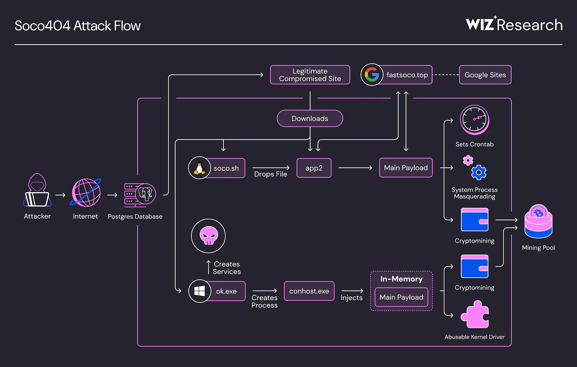 Исследователи компании Wiz Research обнаружили новую версию масштабной кампании по криптомайнингу, получившую название Soco404. Атака отличается использованием поддельных страниц с ошибкой 404, куда злоумышленники встраивают вредоносные нагрузки. Эта кампания нацелена как на Linux, так и на Windows-системы, применяя платформо-специфичные методы заражения и скрытия активности.
