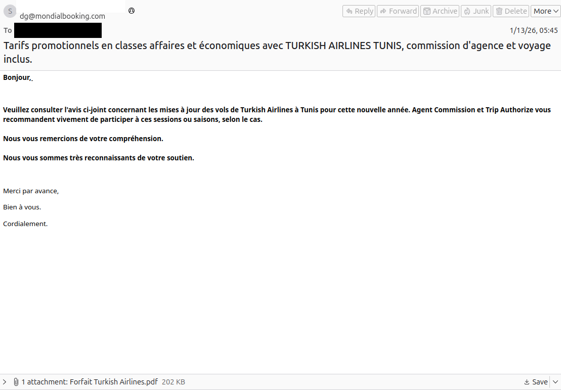 Кампания началась 13-14 января с рассылки вредоносных писем на французском языке, связанных с тематикой путешествий. Вложение в виде PDF-файла содержало ссылку для установки несуществующего «отсутствующего плагина Adobe», которая на самом деле вела к загрузке и установке клиента Bluetrait RMM. После получения первоначального доступа злоумышленники перешли к интерактивным действиям, что подтверждает целенаправленную атаку, а не работу автономного вредоносного ПО.