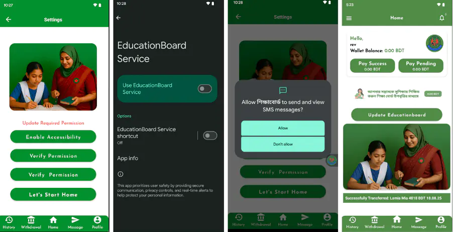 Специалисты Cyble Research and Intelligence Labs (CRIL) обнаружили новую целенаправленную вредоносную кампанию под названием SikkahBot, которая с июля 2024 года активно атакует учащихся в Бангладеш. Вредоносная программа маскируется под приложения Совета по образованию Бангладеш, предлагая ложные стипендии и похищая конфиденциальные данные жертв. Злоумышленники используют методы социальной инженерии, вынуждая пользователей предоставлять опасные разрешения, что позволяет контролировать устройства и проводить несанкционированные банковские операции.