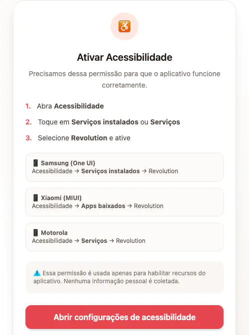 После установки жертва видит профессионально сделанный экран онборндинга, который с помощью социальной инженерии просит включить службу доступности с названием «Revolution». Страница содержит пошаговые инструкции для разных производителей устройств (Samsung, Xiaomi, Motorola) и лживо заверяет, что разрешение нужно «только для включения функций приложения» и никакие личные данные не собираются. После предоставления этого критически важного разрешения троянец получает практически неограниченный доступ к устройству, а пользователь перенаправляется на легальный сайт Banco do Brasil, чтобы усыпить бдительность.