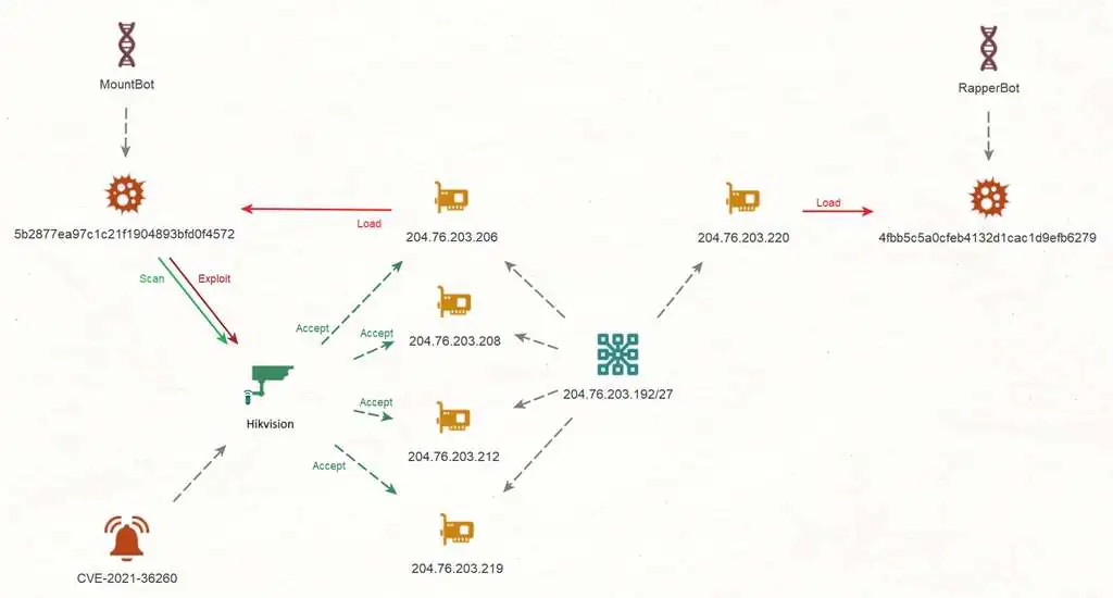 Технические корни и связь с RapperBot. MountBot использует ту же сетевую инфраструктуру, что и ботнет RapperBot - подсеть 204.76.203.192/27, размещенную у немецкого хостинг-провайдера. Оба семейства регулярно обновляются, а их командные серверы (Loader) расположены в идентичном диапазоне IP. Это указывает на общую группу разработчиков или тесное сотрудничество между злоумышленниками. Параллели прослеживаются и в тактике: как и RapperBot, MountBot распространяет разные версии вредоноса в зависимости от типа встроенного сканера.