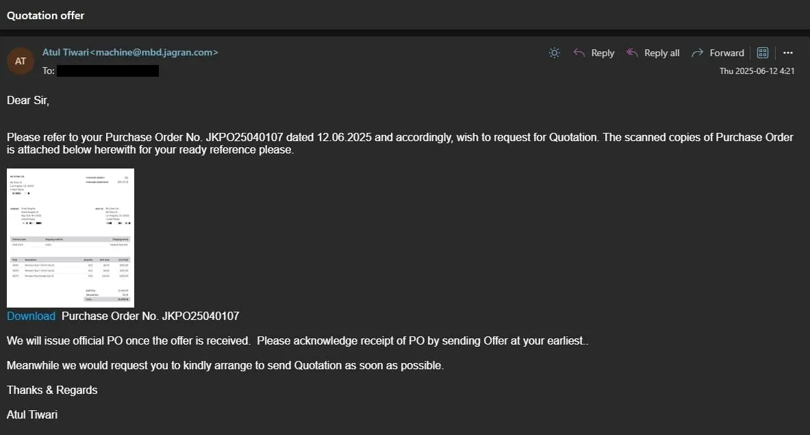 Атака начинается с электронных писем, маскирующихся под коммерческие предложения с темой "Quotation offer". Жертвам предлагается загрузить "высококачественную версию" фиктивного заказа, что приводит к скачиванию JavaScript-файла с платформы Mediafire.