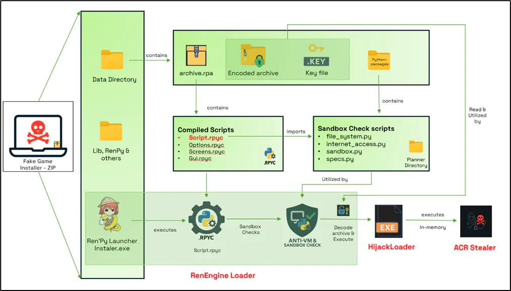 Первоначальный доступ обеспечивается через пиратские установщики игр. После запуска активируется первая стадия атаки - RenEngine Loader. Этот загрузчик внедрен в легитимный лаунчер на базе движка Ren'Py. Он выполняет встроенный скомпилированный Python-скрипт, который извлекает конфигурацию из зашифрованного файла. Конфигурация, декодируемая из Base64 и JSON, содержит параметры для следующего этапа, включая имя файла, ключ XOR для его расшифровки и исполняемый файл. Важной особенностью RenEngine Loader является продвинутая проверка окружения на наличие признаков песочницы (sandbox). Загрузчик анализирует объем оперативной памяти, дискового пространства, количество ядер процессора, серийные номера устройств, модели, производителей, записи реестра, драйверы и активные процессы. На основе собранных данных вычисляется оценка, и если система определяется как виртуальная среда для анализа, выполнение вредоносного кода прекращается.