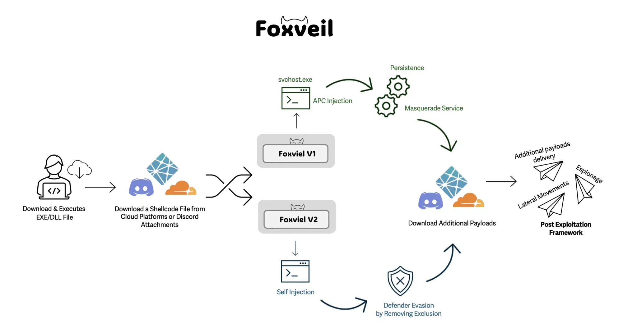 Foxveil является загрузчиком начальной стадии. После запуска он обращается к контролируемым злоумышленниками ресурсам, загружает полезную нагрузку в виде shellcode (часто сгенерированного инструментом Donut) и выполняет её через инъекцию, используя разные методы в зависимости от варианта.