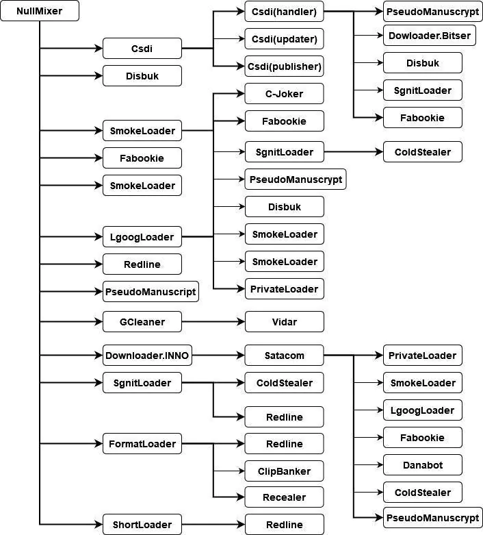 Похоже, что эти сайты используют SEO, чтобы оставаться в верхней части результатов поисковых систем, что позволяет легко найти их при поиске в Интернете по словам "кряки" и "кейгены". Когда пользователи пытаются загрузить программное обеспечение с одного из этих сайтов, они многократно перенаправляются и попадают на страницу, содержащую инструкции по загрузке и заархивированную защищенную паролем вредоносную программу, маскирующуюся под нужное программное обеспечение. Когда пользователь извлекает и запускает NullMixer, он сбрасывает на зараженную машину несколько файлов вредоносного ПО. Среди этих семейств вредоносных программ могут быть бэкдоры, банкиры, похитители учетных данных и так далее. Например, среди семейств, сбрасываемых NullMixer, есть следующие: SmokeLoader/Smoke, LgoogLoader, Disbuk, RedLine, Fabookie, ColdStealer.