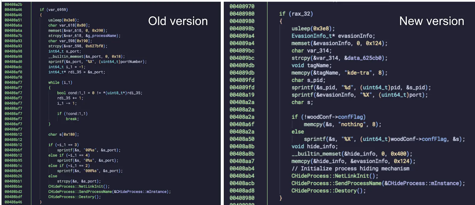 Сетевое взаимодействие упрощено: вместо сложного алгоритма с рандомизированными интервалами между пакетами и днями ожидания, теперь используется лаконичный цикл while (true). После задержки запуска бэкдор непрерывно вызывает ConnectToSvr(), при неудаче делая короткие паузы, и завершает работу по истечении таймера. Это повышает надёжность соединения с C2 ценой снижения временной маскировки. Протокол связи и структура C2 остались без изменений, однако конфигурационные тайм-ауты более не применяются.