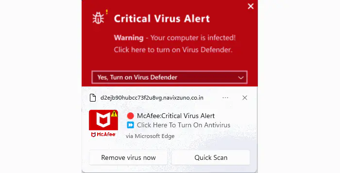 После этого начинается основной этап атаки. Пользователь проходит викторину, не подозревая о последствиях, а в фоновом режиме сайт получает канал для прямой доставки контента. Через этот канал злоумышленники начинают массово рассылать рекламу, часто связанную с партнёрскими программами, мошенническими схемами или предложениями скачать нежелательное программное обеспечение. Вредоносные уведомления могут маскироваться под предупреждения системы безопасности, сообщения об ошибках или срочные оповещения, вынуждая пользователя кликать по ним и попадать на фишинговые или заражённые страницы. Ключевая опасность заключается в том, что для обычного человека определить источник таких уведомлений практически невозможно, так как они отображаются средствами операционной системы, а не в окне браузера.